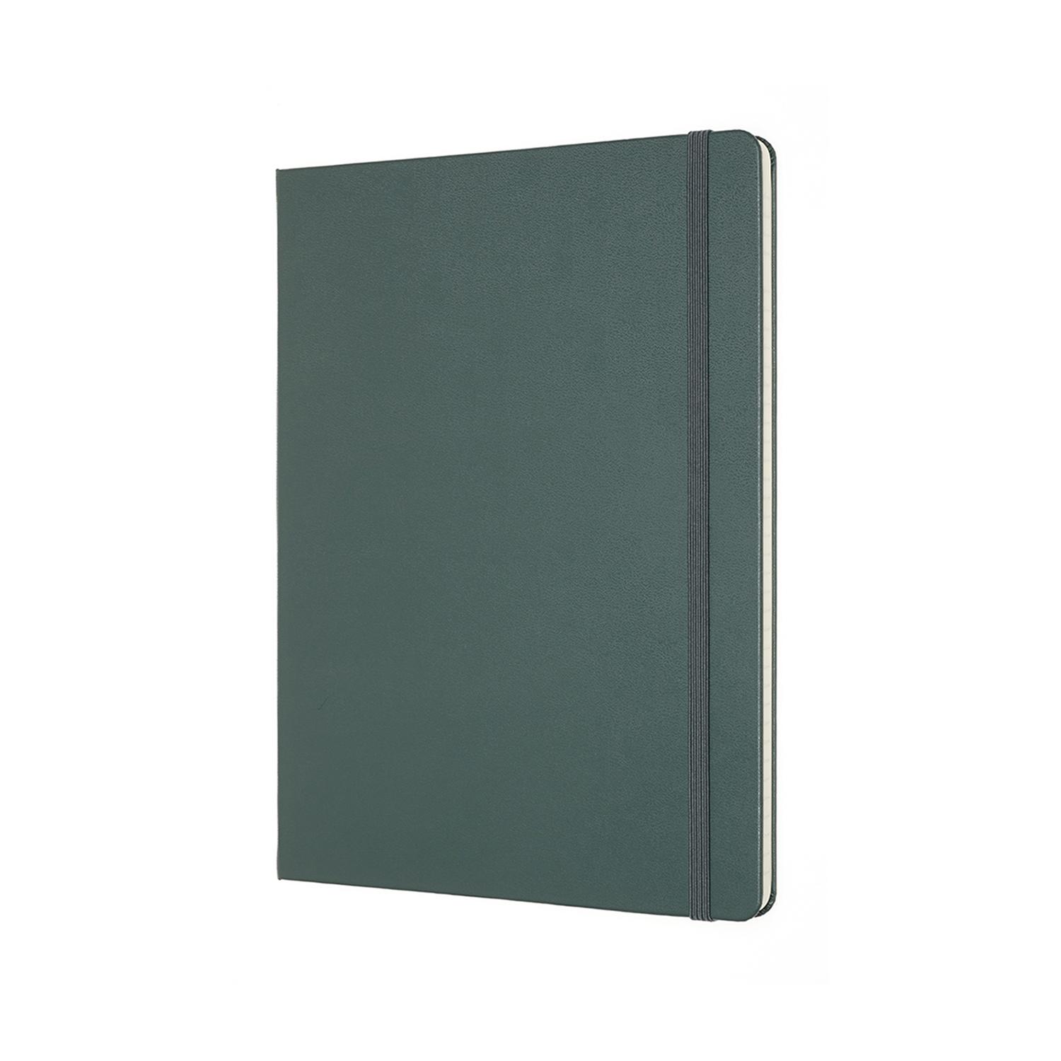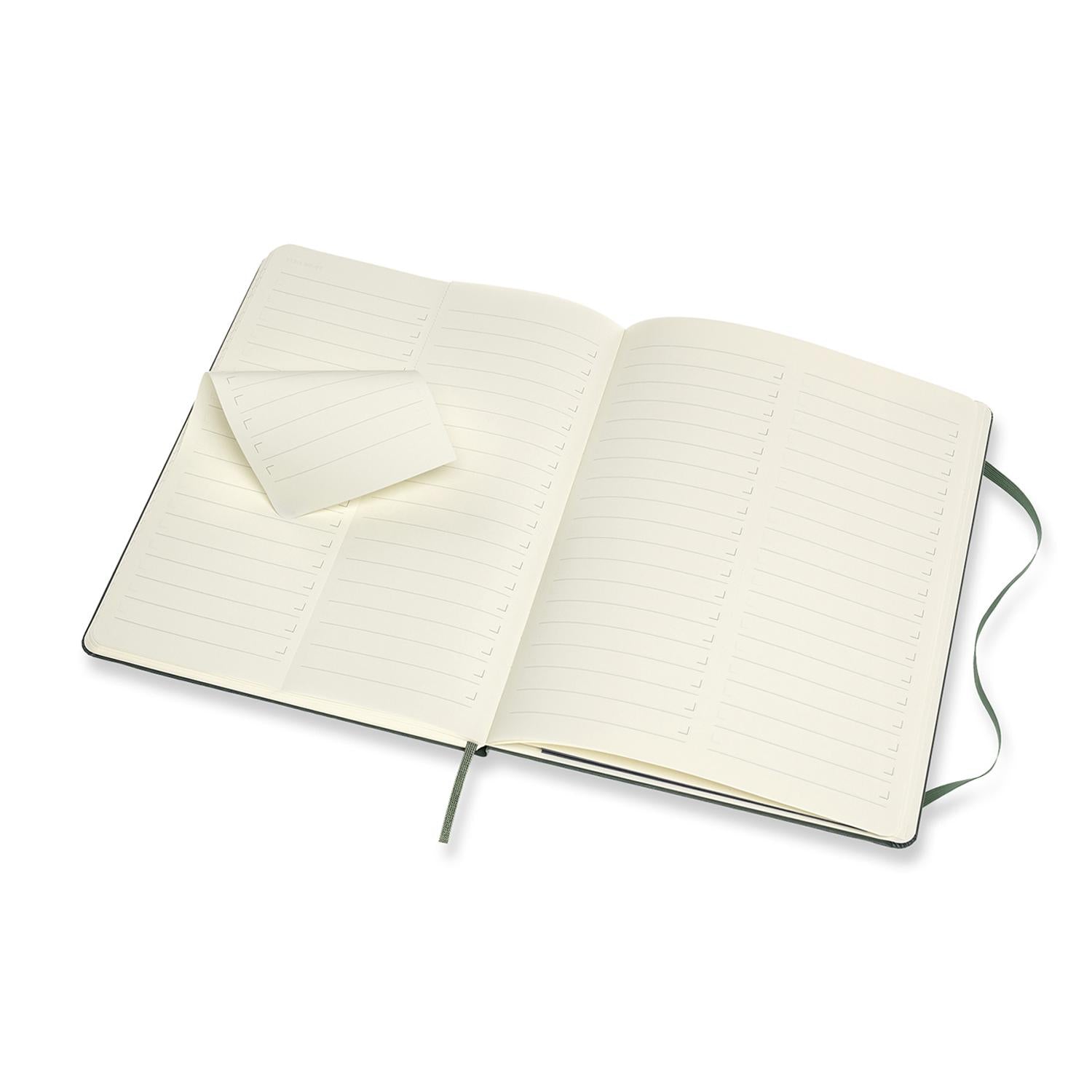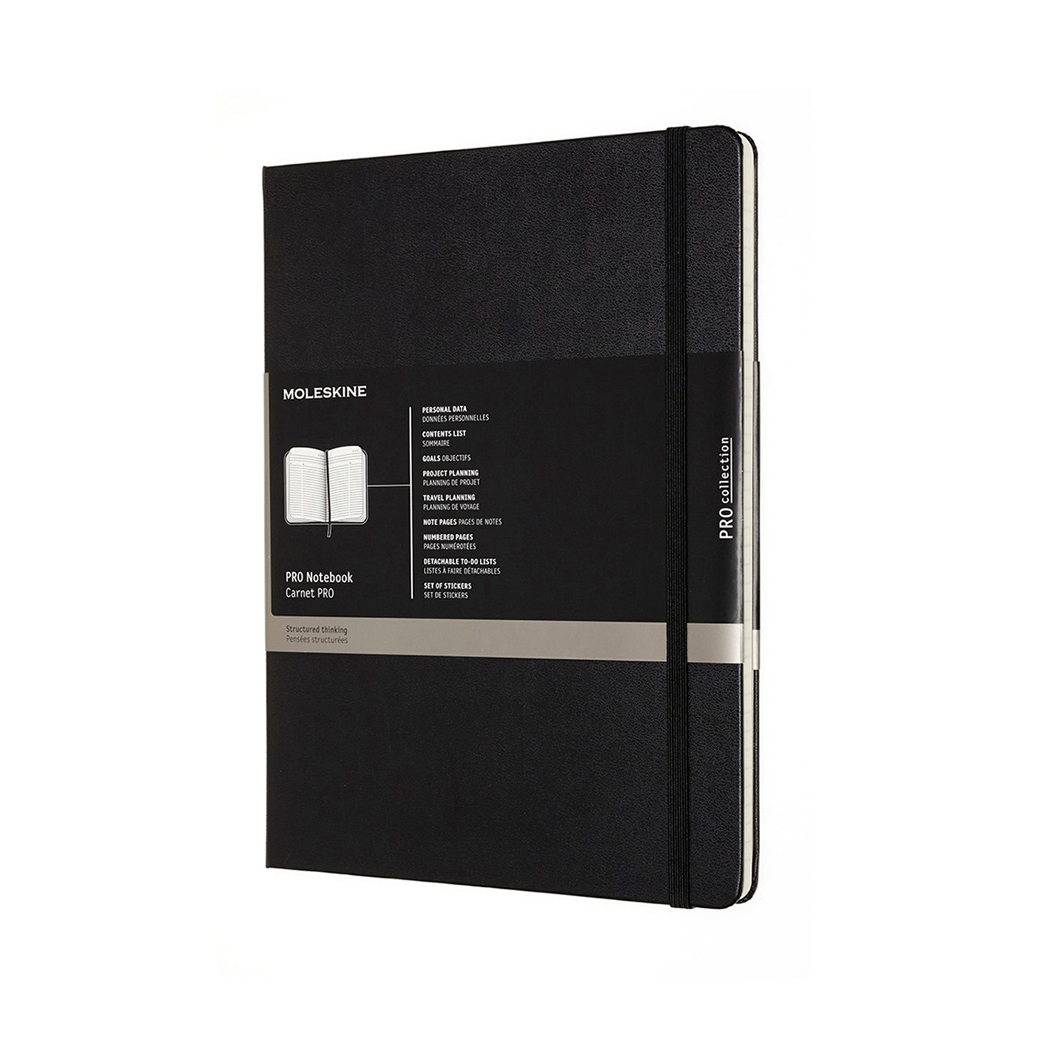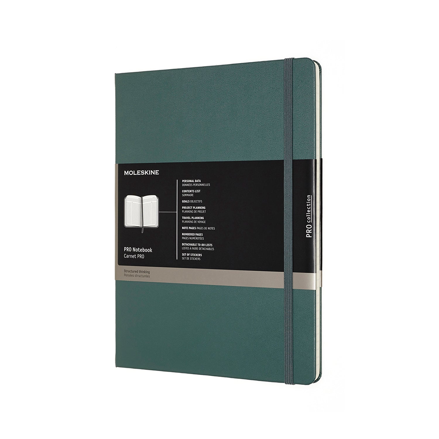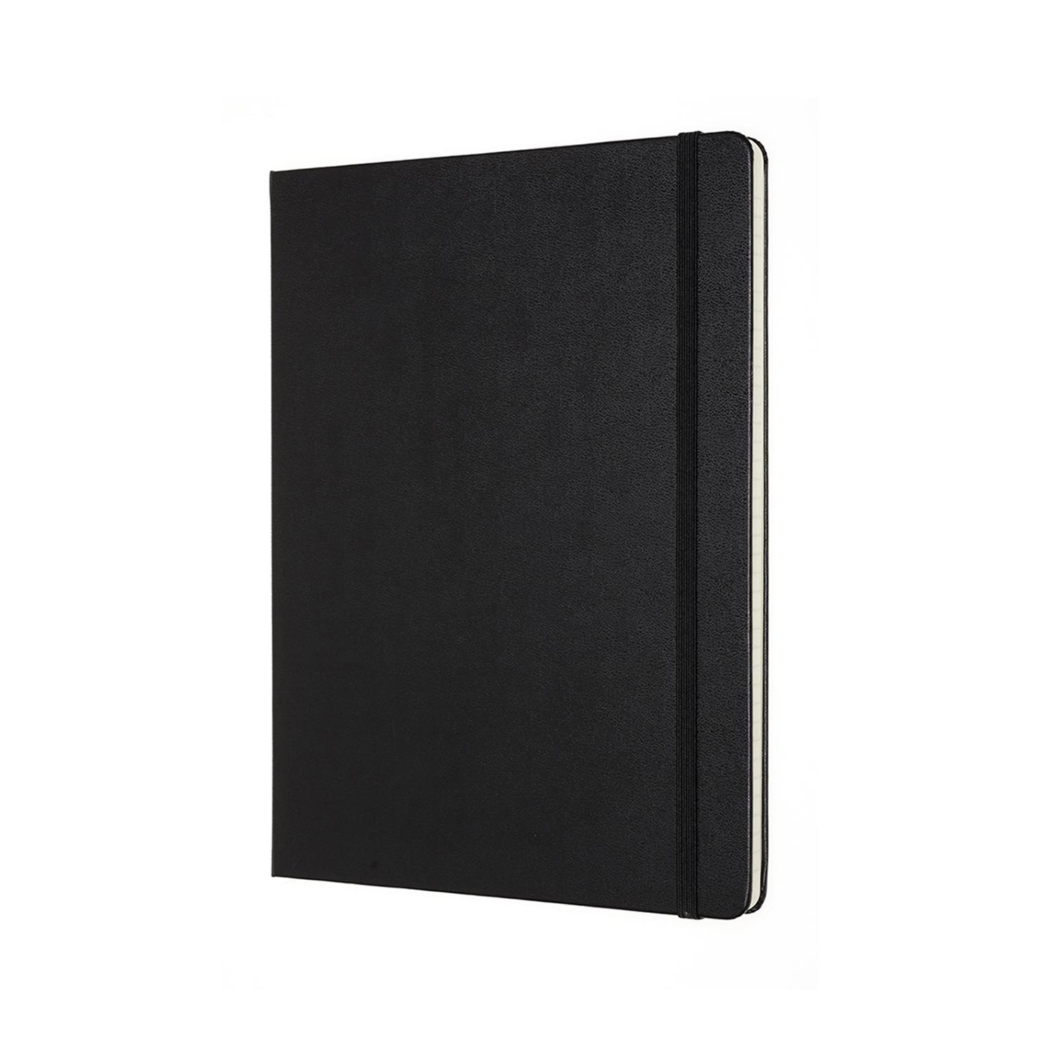 This Moleskine Professional Notebook in extra large has a hard cover with rounded corners, a ribbon bookmark, an elastic closure and a double expandable inner pocket in cardboard and cloth. There are 192 acid-free numbered pages and the last 8 are not numbered and are detachable. The notebook comes with a sheet of adhesive tabs and adhesive labels for spine and/or cover.